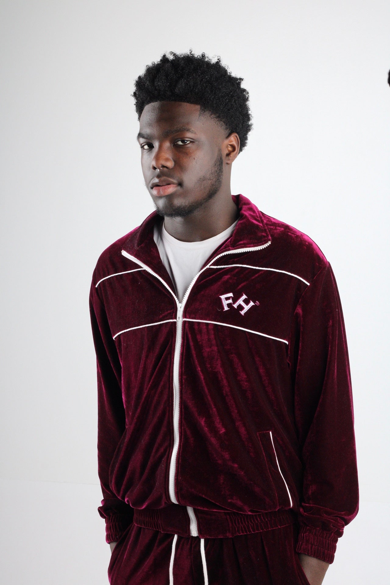 A premium red and white velvet tracksuit crafted from soft, plush fabric with a luxurious feel. Featuring bold contrast colors and a stylish, relaxed fit, this set blends comfort with modern streetwear design—perfect for casual days or standout leisure looks, reflecting the brand’s confidence-meets-humility ethos.
